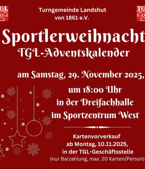 Am ersten Adventssamstag, 29. November, findet um 18 Uhr die große TGL-Sportlerweihnacht in der Dreifachhalle der Turngemeinde im Sportzentrum West statt. Das Motto 2025: „TGL-Adventskalender“. Karten gibt es ab Montag, 10. November, 8 Uhr, in der TGL-Geschäftsstelle.