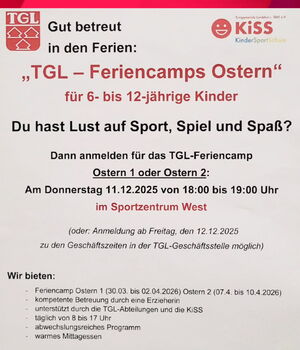 Willkommen bei der TGL! 🏋️♀️ Frag mich zu Sportangeboten, Kursen, Terminen oder Mitgliedschaft – ich helfe dir weiter.