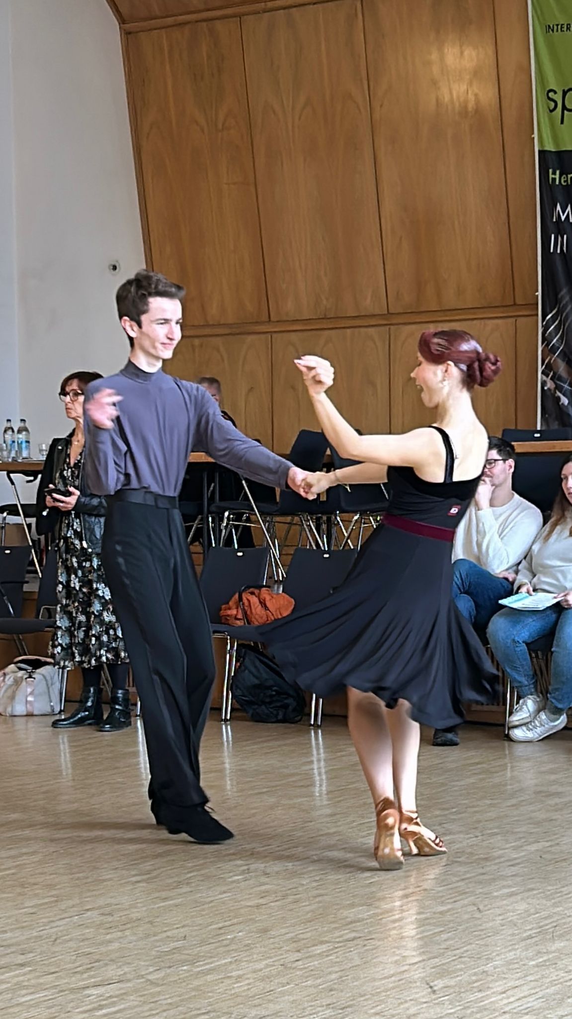 Das Turnier begann mit der Sichtungsrunde der Hauptgruppe D Standard und dem anschließenden Finale, in dem sich David Kreitmaier und Alina Maria Czoppik den 6. Platz ertanzten.