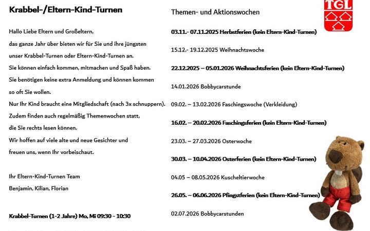 Willkommen bei der TGL! 🏋️♀️ Frag mich zu Sportangeboten, Kursen, Terminen oder Mitgliedschaft – ich helfe dir weiter.